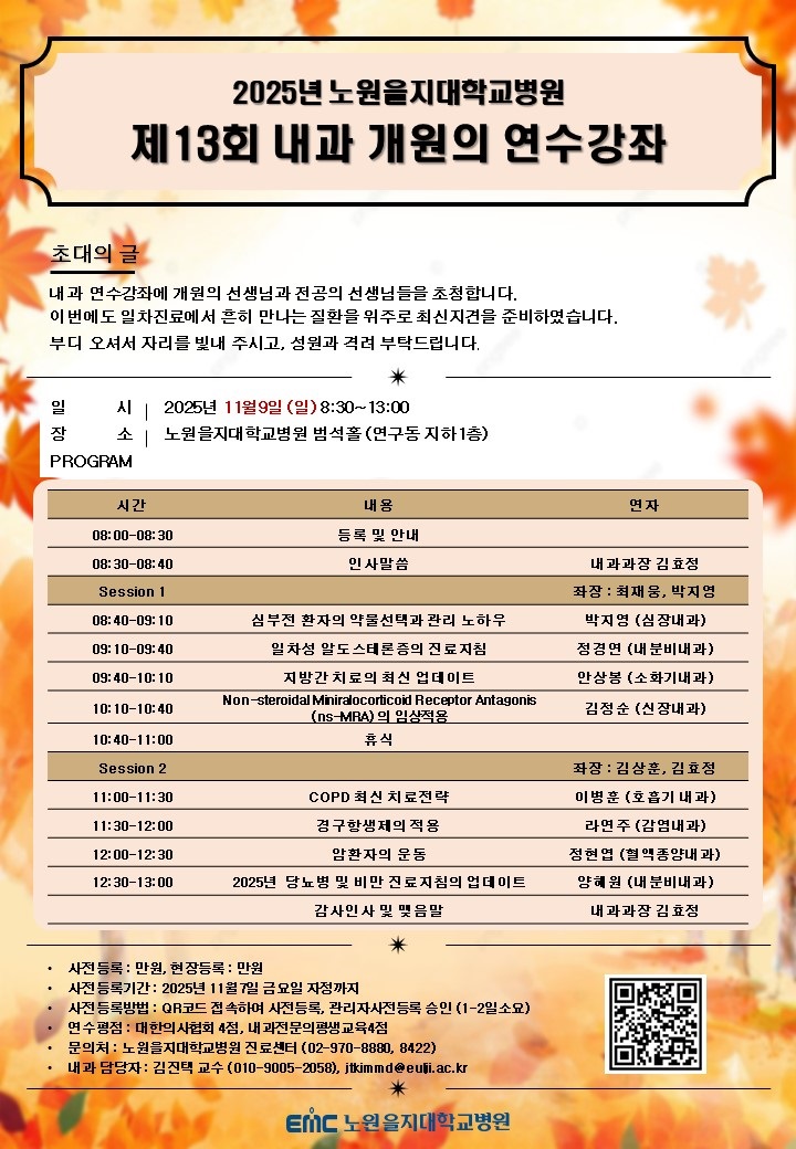 2025년 노원을지대학교병원 내과 개원의 연수강좌 안내 (일시: 2025.11.09(일), 8:30~13:00)